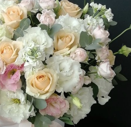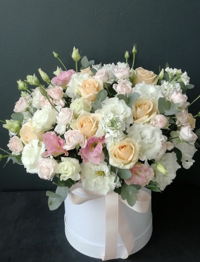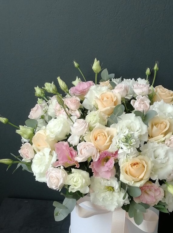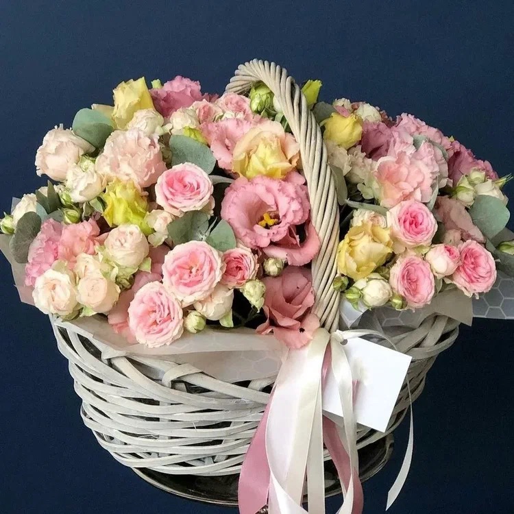 Эта цветочная композиция из роз и лизиантусов - это утонченное сочетание романтики и изящества. Розы, как символ любви и страсти, переплетаются с нежными лизиантусами, создавая образ неповторимой красоты и элегантности. Эта композиция идеально подходит для создания романтической атмосферы и дарения нежных чувств близким людям.