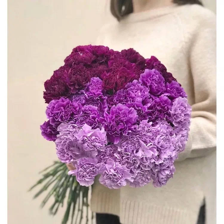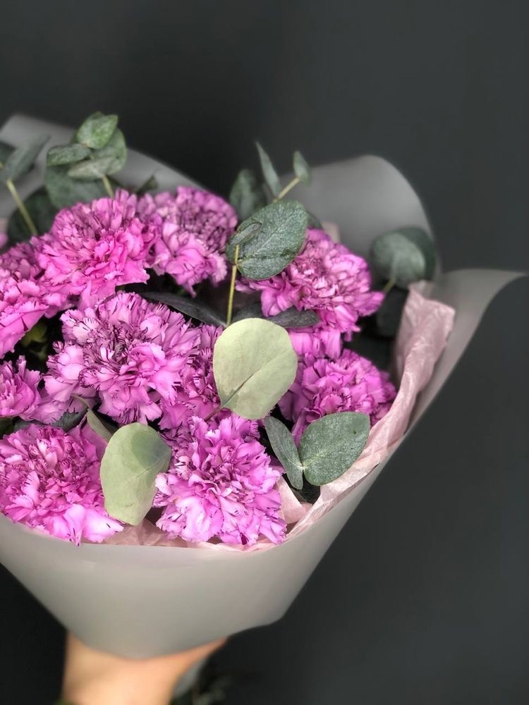 Этот букет фиолетовых гвоздик создает атмосферу загадочности и мистики, будто приглашая вас на увлекательное путешествие в мир фантазий. Фиолетовые гвоздики в этом букете удивительно сочетаются с другими цветами и добавят вашему интерьеру изысканности и шарма.