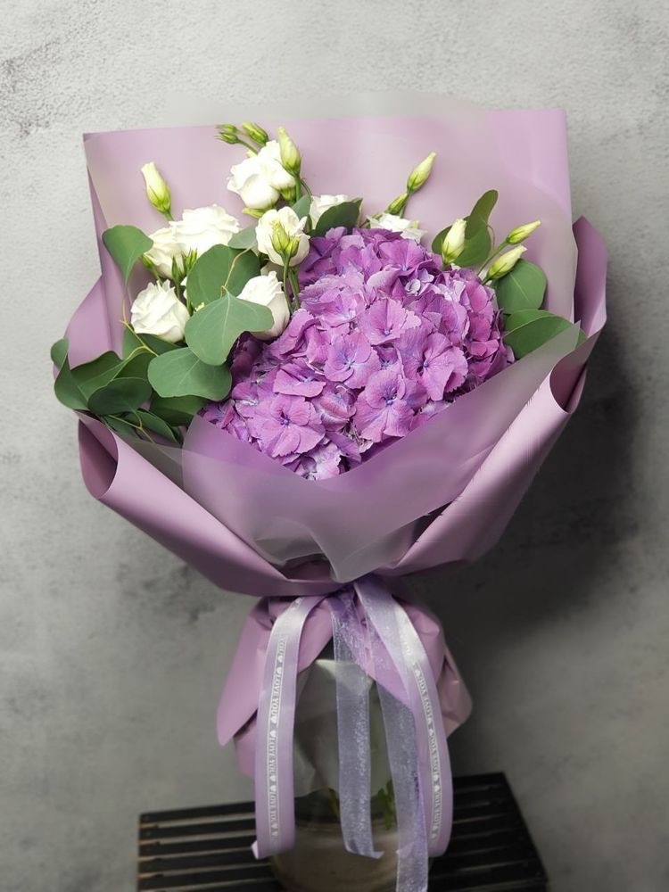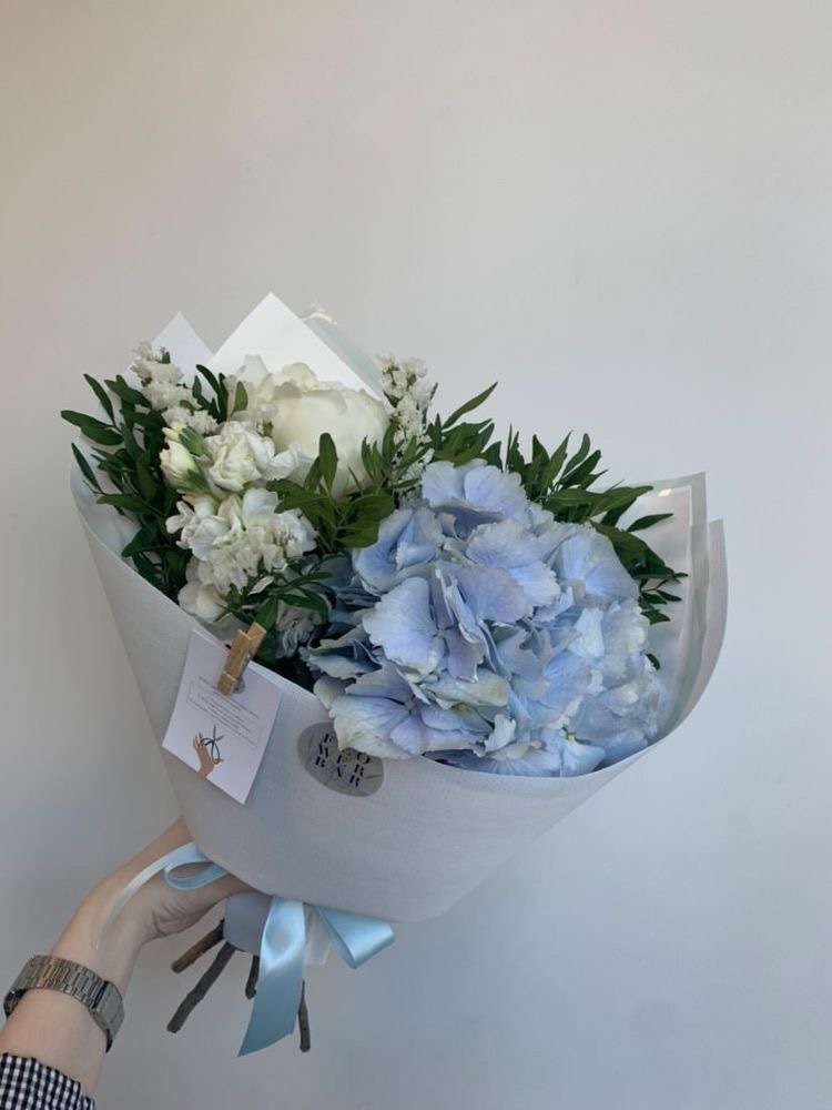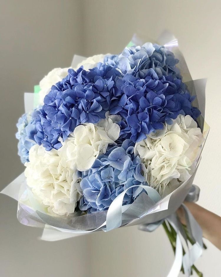 Этот букет из гортензий сине-белого оттенка напоминает о бескрайнем небе и свежей прохладе океана. Он вызывает чувство гармонии и спокойствия, словно мягкий бриз, окутывающий вас в своем объятии. Этот букет станет отличным подарком для тех, кто ценит красоту и гармонию природы.